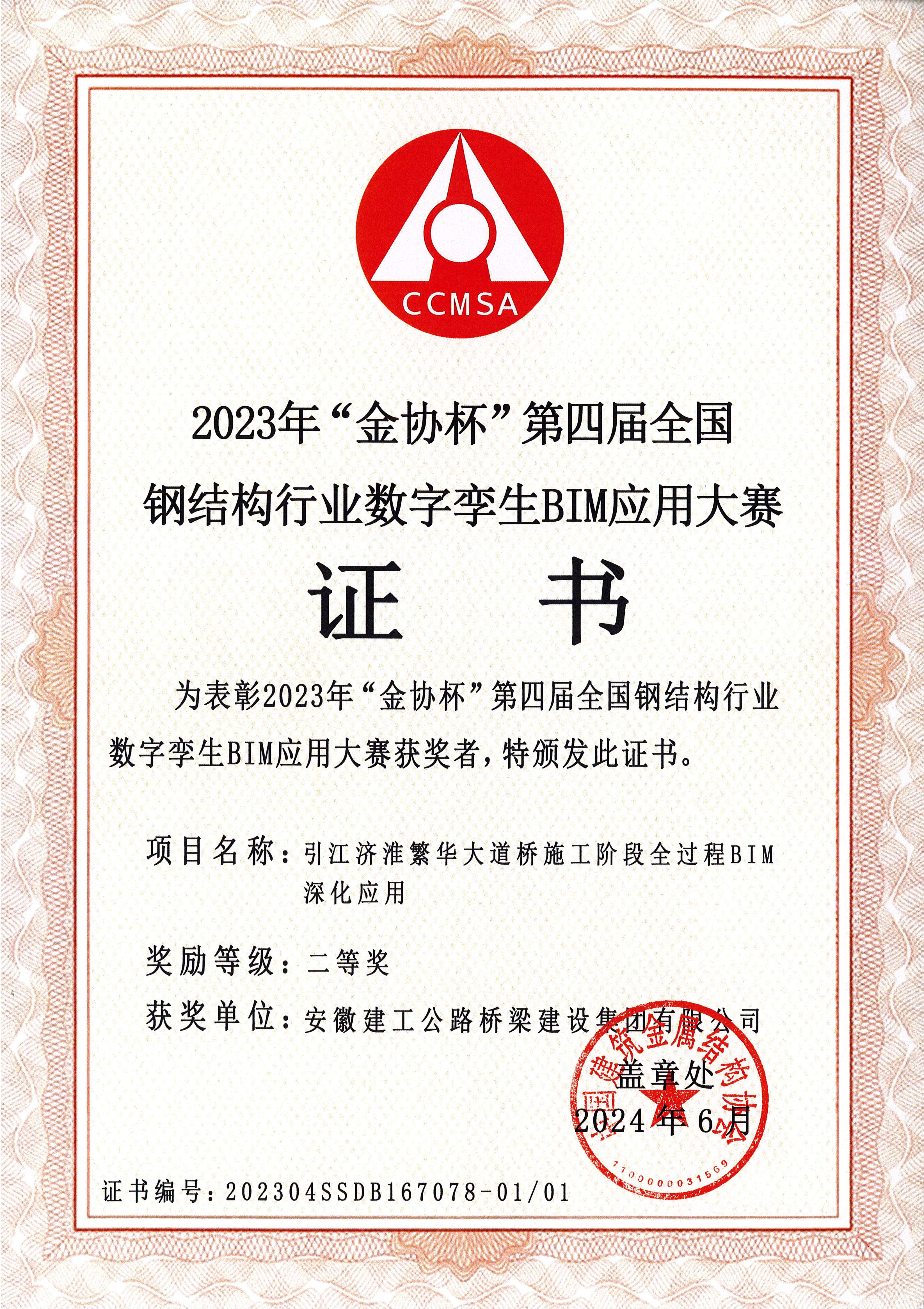 近日,2024年全國建筑鋼結(jié)構(gòu)行業(yè)數(shù)字孿生高峰論壇暨“金協(xié)杯”第四屆BIM應(yīng)用大賽表彰大會(huì)在鄭州隆重召開。公司選送的“引江濟(jì)淮繁華大道橋施工階段全過程BIM深化應(yīng)用”成果獲得二等獎(jiǎng)。
