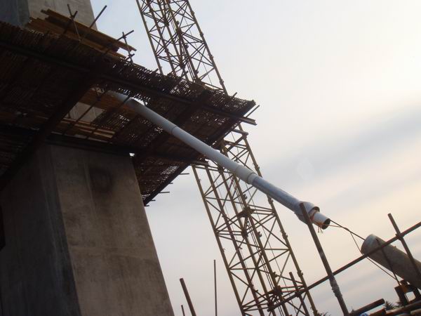 該斜拉索長19.0米,重1噸,由43根鋼絞線組成。據(jù)悉,六安淠望路大橋主塔共有斜拉索60根,由高強(qiáng)度、低松馳的光面鋼絞線組成。單根鋼絞線直徑為15.2mm,標(biāo)準(zhǔn)強(qiáng)度fpk=11860Mpa。斜拉索采用三層防護(hù):第一層涂油脂或石蠟,第二層為單根鋼絞線熱擠單層PE層,第三層整體索外包HDPE雙層護(hù)套。主塔的左、右幅索塔各布置了15對(duì)斜拉索,最大索長123.0米,重12噸,由73根鋼絞線組成。 整個(gè)斜拉索施工計(jì)劃到2010年4月份完成。