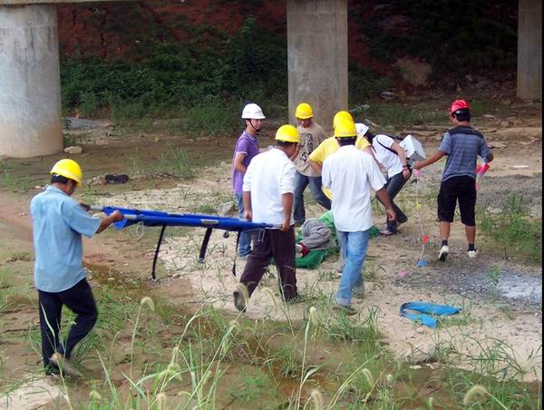 接下來,對參演人員進(jìn)行角色分工和任務(wù)分配。所有參加演練的人員來到項目正在進(jìn)行的30米箱梁預(yù)制場門架附近待命。4點鐘,演練行動正式開始。項目負(fù)責(zé)人接到報告,K11+300水陽江1#橋面施工區(qū)域發(fā)生高墜事故。由于水陽江橋施工現(xiàn)場地處偏遠(yuǎn),距離主干道路和項目部及醫(yī)院都較遠(yuǎn),給自救和救援帶來嚴(yán)重考驗。搶救疏散組及時啟動《高墜事故應(yīng)急救援預(yù)案》,在以項目經(jīng)理為主的事故應(yīng)急救援領(lǐng)導(dǎo)小組領(lǐng)導(dǎo)下,各事故應(yīng)急救援機(jī)構(gòu)各司其職。搶救疏散組立即組織搶救受傷人員,將汽車、設(shè)備、救護(hù)人員派到事發(fā)地點,并對現(xiàn)場人員進(jìn)行疏散隔離。救護(hù)人員第一時間對高墜傷者進(jìn)行了初步檢查,判定傷者暫時沒有生命危險,并對其發(fā)生骨折的右上肢進(jìn)行了夾板保護(hù),在搶救疏散組的協(xié)作下,傷者立即通過擔(dān)架進(jìn)行轉(zhuǎn)移,送往醫(yī)院。