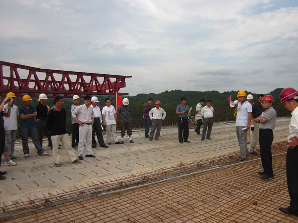 下午15:30,在大廣高速龍楊段項目辦、高駐辦相關(guān)領(lǐng)導(dǎo)帶領(lǐng)下,全線各高駐辦、施工單位主要負(fù)責(zé)人徒步參觀了我標(biāo)江口大橋施工現(xiàn)場。實地考察中,我標(biāo)項目經(jīng)理羅權(quán)針對水混凝土橋面鋪裝施工情況作了簡要介紹,并就部分施工細(xì)節(jié)問題與觀摩團進行了深入交流。